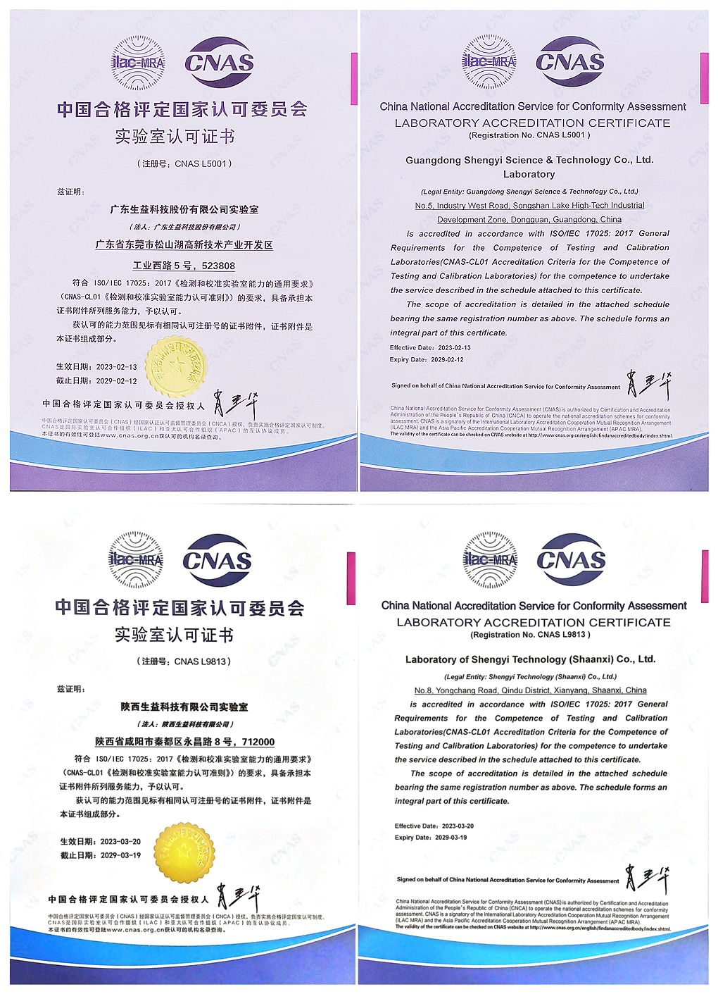 陕西必发bifa官方网站实验室于2017年3月取得CNAS实验室资格。(右图为CNAS2023年3月-2029年3月实验室认可证书)